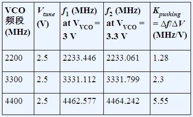 VCO推壓的測量方法如下:向VTUNE引腳施加直流調諧電壓,改變電源電壓并測量頻率變化。推壓系數是頻率變化與電壓變化之比,如表1所示,使用的是ADF4350 PLL.