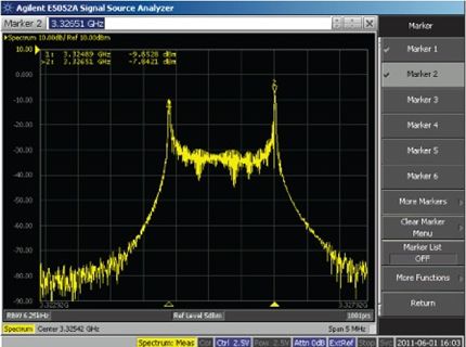 另一種方法:將低頻方波直流耦合至電源內,同時觀察VCO頻譜任一側上的頻移鍵控 (FSK)調制峰值(圖2)。峰值間頻率偏差除以方波幅度,便得出VCO推壓系數。該測量方法比靜態直流測試更精確,因為消除了與直流輸入電壓變化相關的任何熱效應。圖2顯示ADF4350 VCO輸出在3.3 GHz、對標稱3.3 V電源施加10 kHz、0.6 V p-p方波時的頻譜分析儀曲線圖。對于1.62 MHz/0.6 V或2.7 MHz/V的推壓系數,最終偏差為3326.51 MHz – 3324.89 MHz = 1.62 MHz.該結果可與表1中的靜態測量 2.3 MHz/V比較。