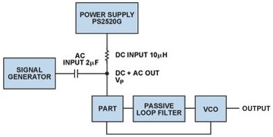 電荷泵的低功耗使其看似頗具吸引力,可使用升壓轉換器從較低的電源電壓產生高電荷泵電壓,然而與此類DC-DC轉換器相關的開關頻率紋波可能在VCO的輸出端產生干擾雜散音。高PLL雜散可能造成發射機發射屏蔽測試失敗,或者降低接收機系統內的靈敏度和帶外阻塞性能。為幫助指導轉換器紋波的規格,使用圖6的測量設置針對各種PLL環路帶寬獲得全面電源抑制曲線圖與頻率的關系。