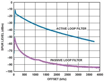 電荷泵將鑒相器誤差電壓轉換為電流脈沖,并通過PLL環路濾波器進行積分和平滑處理。電荷泵通常可在最多低于其電源電壓(VP)0.5 V的電壓下工作。例如,如果最大電荷泵電源為5.5 V,那么電荷泵只能在最高5 V輸出電壓下工作。如果VCO需要更高的調諧電壓,則通常需要有源濾波器。有關實際PLL的有用信息和參考設計,請參見電路筆記CN-0174,5,處理高壓的方式請參見利用高壓VCO設計高性能鎖相環,"6該文章發表于模擬對話第43卷第4期(2009)。有源濾波器的替代方案是使用PLL和針對更高電壓設計的電荷泵,例如ADF4150HV ADF4150HV可使用高達30 V的電荷泵電壓工作,從而在許多情況中省去了有源濾波器。