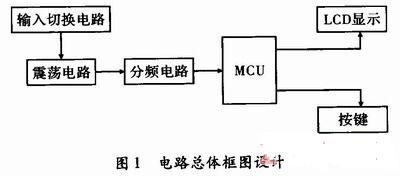 如圖1所示??驁D包括輸入切換部分、振蕩部分、分頻部分、單片機部分、顯示部分和鍵盤部分。此系統由STC89C51單片機作為控制核心,輸入切換部分采用雙刀雙擲繼電器完成待測電容或電感的線路切換,振蕩電路工作在放大諧振狀態,頻率有高頻管9018的集電極輸出,由于頻率較高,所以需經過信號分頻,再者由于輸出的電壓幅度大,此處無需再加一級驅動,以74LS393數字分頻芯片,把分頻端級聯實現100分頻,最終信號進入單片機,由單片機計算出頻率,經過算法設計,實現未知電容或電感參數的測定。圖1給出了系統的總體框架圖。