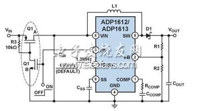 升壓轉換器使用電壓或電流反饋來調節選定的輸出電壓;控制環路則可根據負載變化保持輸出調節。低功耗升壓轉換器的工作頻率范圍一般是600 kHz到2 MHz.開關頻率較高時,所用的電感可以更小,但開關頻率每增加一倍,效率就會降低大約2%.在ADP1612 和ADP1613升壓轉換器(參見附錄)中,開關頻率可通過引腳選擇,最高效率下的工作頻率為650 kHz,最小外部器件的工作頻率為1.3 MHz.對于650 kHz的工作頻率,將FREQ 連接至GND,而1.3 MHz的工作頻率則連接至VIN.