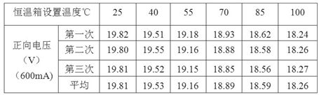 確定正向電壓與結溫的關系的試驗步驟為:1)將光源置入恒溫箱中;2)設置恒溫箱的溫度;3)待恒溫箱內溫度充分平衡穩定后,在光源兩端接入恒流源;4)迅速測量光源的正向電壓并記錄;5)重復上述步驟1)~(4),恒溫箱溫度由低到高,測得多點數據。