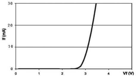 LED的伏安特性和普通的二極管相似。用于白光照明的藍光LED典型的伏安特性如圖1所示。