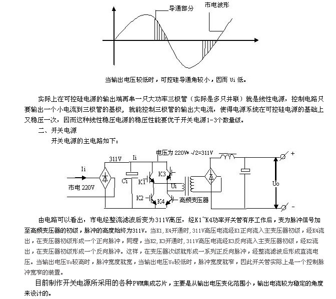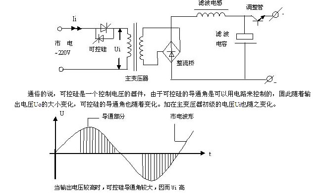 也就是~220V市電經(jīng)可控硅控制后只有一部分加在主變壓器的初級。當(dāng)輸出電壓Uo較高時(shí),可控硅導(dǎo)通角較大,大部分市電電壓被可控硅“放過來了”(如上圖所示),因而加在變壓器初級的電壓,即Ui較高,這當(dāng)然經(jīng)整流濾波后輸出電壓也就比較高了。