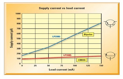 圖 1:不同的低壓降穩壓器在滿載電流范圍內的供電電流 (Iq) 比較,比較的兩款大致相同的 150mA 低壓降穩壓器分別采用 CMOS 及雙極工藝技術制造