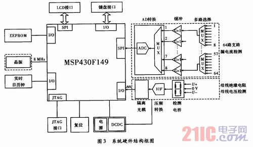 直流接地檢測系統(tǒng)采用低功耗處理器MSP430F149為硬件核心,外圍電路可分為數(shù)據(jù)采集模塊、人機交互模塊、處理器模塊。數(shù)據(jù)采集模塊負責檢測64路支路的漏電流、母線電壓、母線絕緣電阻;人機交互模塊負責進行液晶顯示和鍵盤輸入;處理器模塊負責協(xié)調(diào)整個系統(tǒng)的數(shù)據(jù)處理,數(shù)據(jù)存儲,人機交互等。具體的硬件結構框圖,如圖3所示。