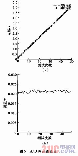 為了達到好的測試效果,A/D采集必須達到一定的測試精度,圖5是A/D采集的實測數(shù)據(jù)和測試誤差分析曲線,從圖中可以看出,A/D采集的誤差約20 mV,屬于正常范圍,因為系統(tǒng)采用8位A/D,5 V基準電壓。這個采樣精度滿足整體的設計要求。