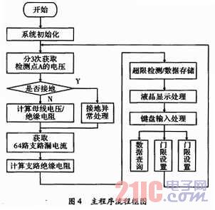 整個程序的編寫均由C語言完成,在程序設計中,采用了結構化程序設計方法,使各個模塊程序相對獨立,便于程序代碼的維護、移植和升級。同時,這樣分離式的程序設計,降低了代碼的調(diào)試難度,縮短了調(diào)試周期。將與接地故障信息(如母線電壓,母線絕緣電阻,支路絕緣電阻,接地支路號等)密切相關的數(shù)據(jù)放在一個結構體里,便于掉電存儲與回放顯示。系統(tǒng)的主程序流程圖,如圖4所示。