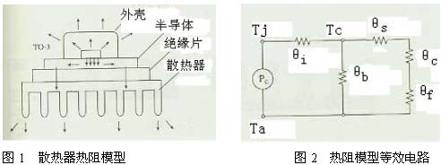 其中,pc:功率管工作時損耗;pc(max):功率管的額定最大損耗;tj:功率管節(jié)溫;tjmax:功率管最大容許節(jié)溫;ta:環(huán)境溫度;tc:預定的工作環(huán)境溫度;θs:絕緣墊熱阻抗;θc:接觸熱阻抗(半導體和散熱器的接觸部分);θf:散熱器的熱阻抗(散熱器與空氣);θi:內(nèi)部熱阻抗(pn結(jié)接合部與外殼封裝);θb:外部熱阻抗(外殼封裝與空氣)