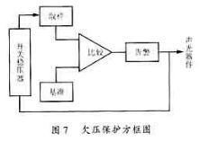 當未穩壓輸入的電壓值正常時,穩壓管ZD擊穿,晶體管V導通,繼電器動作,觸點吸合,開關穩壓器加電。當輸入低于所允許的最低電壓值時,穩壓管ZD不通,V截止,觸點跳開,開關穩壓器不能工作。開關穩壓器內部,由于控制電路失常或者開關三極管失效會使輸出電壓下降;負載發生短路也會使輸出電壓下降。特別在升壓型或反相升壓型的直流開關穩壓器中欠電壓的保護是跟過電流保護緊密相關的,因而更加重要。實現方法是在開關穩壓器的輸出端接電壓比較器,如圖7所示。