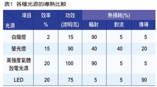 在此情況下,約20%輸入功率轉(zhuǎn)換為光,80%則轉(zhuǎn)換為熱。這取決于多種因素,發(fā)熱可能與底層不規(guī)則以及聲子發(fā)射、密封、材料等有關(guān)。在LED產(chǎn)生的總熱量中,有90%透過傳導(dǎo)傳輸。表1為耗散來自LED接面的熱量,傳導(dǎo)是導(dǎo)熱的主要通道,因?yàn)閷?duì)流和輻射僅占全部熱傳輸約10%。比如一個(gè)LED可能轉(zhuǎn)換近10.72瓦熱量(13.4瓦×0.8)。其中,9.648瓦(10.72瓦×0.9)透過傳導(dǎo)從LED接面?zhèn)鬏敾蜻w移。顯然,LED光源需要精確的功率和熱管理系統(tǒng),因?yàn)榕c其他光源相比,提供給LED的電能大部分轉(zhuǎn)換為熱量。如果沒有適當(dāng)?shù)臒峁芾?,這種熱量會(huì)影響LED壽命和色彩輸出。同時(shí)由于LED驅(qū)動(dòng)裝置屬于硅組件,很快就會(huì)失效,因此必須配備故障安全備用過電流保護(hù)裝置。