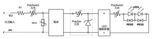 目前,多數(shù)LED應(yīng)用利用功率轉(zhuǎn)換和控制組件連接各種功率源,如交流電線、太陽能電池板或電池,來控制LED驅(qū)動(dòng)裝置的功率耗散。對(duì)這些接口加以保護(hù),防止它們因過流和過溫而受損,常常用到具有可復(fù)位能力的聚合物正溫度系數(shù)(PPTC)組件(圖2)。可以與功率輸入串聯(lián)一個(gè)PolySwitch LVR組件,防止因電氣短路、電路超載或用戶誤操作而受損。此外,放在輸入端上的金屬氧化物變阻(MOV)也有助于LED模塊內(nèi)的過壓保護(hù)。