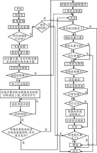 進行太陽能路燈電池板電流檢測,蓄電池電壓檢測,蓄電池電量監(jiān)測,以及環(huán)境溫度的檢測,采用光開時關(guān),并實時上傳工作環(huán)境及狀態(tài)數(shù)據(jù),預警故障,保證系統(tǒng)的可靠性。圖2為太陽能路燈的開、關(guān)控制流程網(wǎng)。
