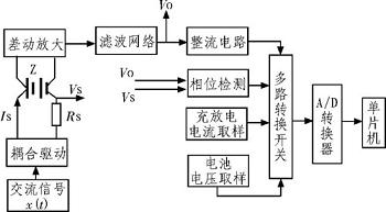 給電池施加一個固定頻率和固定電流(日前一般使用l kHz頻率、50 mA小電沆),然后對其電壓進行采樣,經(jīng)過整流、濾波等一系列處理后通過運放電路計算出該電池的內(nèi)阻值。圖4為在線測量剩余電量硬件框圖。