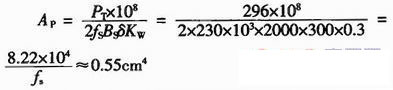 變壓器的實際輸出能力AP=Ae×Aw=0.55cm4,磁芯滿足設計要求。