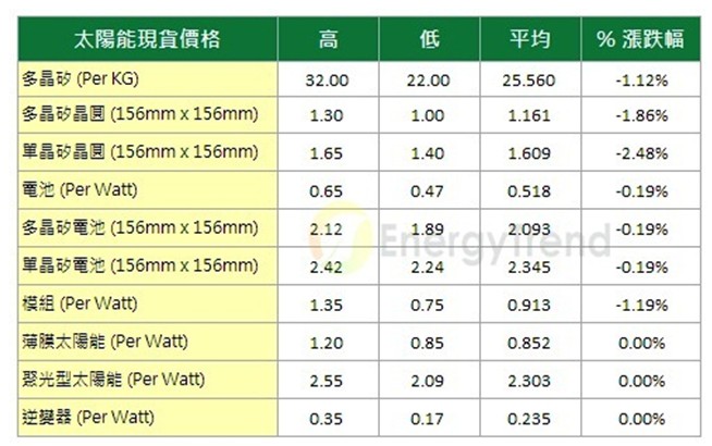 而在電池方面,最低價格來到每瓦0.47美元,平均價格則滑落到每瓦0.518美元Watt,跌幅為0.19%;另外在模組方面,雖然硅晶太陽能模組的平均價格持續下滑到每瓦0.913美元,跌幅為1.19%。展望未來,EnergyTrend認為隨著低價庫存 水位降低,預估未來價格破底的機率將減緩,而且價差將持續縮小。