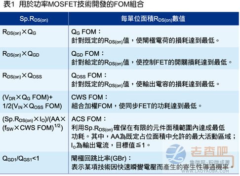 對于控制FET方面而言,由于現代功率MOSFET的高增益特性,其電流升降時間由電路和源極電感決定,因此其余能耗則由電壓升降時間決定,而這些時間則取決于QGD FOM。因此,單獨為控制FET定義一個FOM組合并無實際益處。雖然CWS FOM可達成最佳化以應用于同步FET,也可用于判定COSS、CGD和CGS之間由于裝置結構所產生的不利影響,但是要注意的是,由于現代元件的QGD相當低,因此,QGD不再是控制FET中功耗的主要因素。另外,由于控制FET的體積相對較小,基本上面積限制晶片尺寸的問題已不復存在,因此,采用面積受到限制的FOM亦無法增加優勢。