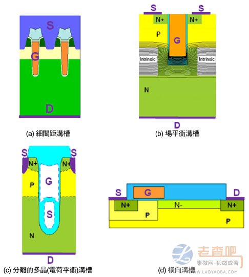 圖1標示出目前常用的多種功率MOSFET元件結構。圖1a中所示的高密度溝槽結構采用較低的Sp.RDS(on),但QG和QGD較高,因為此兩個參數與單元密度成正比。此種結構通常用于開關損耗較無重要性的應用中(如電池保護)??赏高^加大單元間距、于溝槽底部加上厚氧化膜以改善此結構的開關性能。