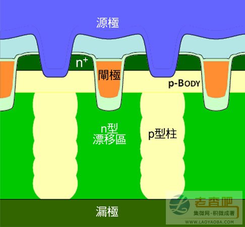 為了克服現有功率MOSFET結構的缺點,目前已經開發出一種采用超級接面概念的新型結構。低壓超級接面MOSFET元件的結構如圖2所示,此結構采用N-type和P-type矽區域交替形成一個多重RESURF結構,換言之,相當于將橫向MOSFET結構先平行放置后,再垂直擺放,進而獲得RESURF結構。這種結構克服橫向結構的單元間距限制,同時,在漂移區內達成RESURF無需如同以往分裂閘結構必須依賴增加單元密度,和在每個溝槽閘下方增加CDS和CGD電容器。完成真正為DC-DC轉換量身打造的元件結構。