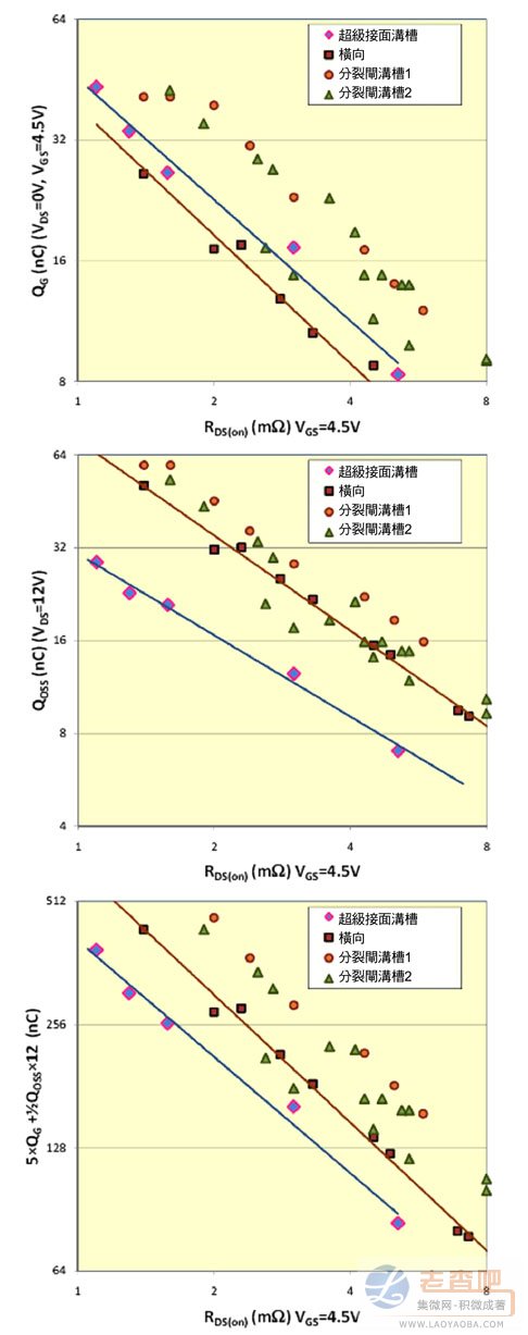 采用QOSS與QG加權組合作為性能指標的優點如圖3所示,其中QG、QOSS及其組合分別針對三個不同的30伏特功率MOSFET結構產生RDS(on)函數。趨勢線的斜率反映不同的FOM。請注意:由于數據來自于資料手冊,因此數值包含封裝電阻。由圖3可知,相較于超級接面和分裂閘溝槽技術,橫向技術的QG更佳。由于超級接面結構在元件閘極和連接源極的漏極遮罩電極間增加了CGS,因此QG值低于分裂閘技術。