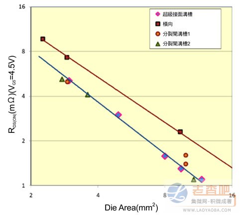 圖4 針對不同的功率MOSFET結構,晶片面積與RDS(on)的關系。