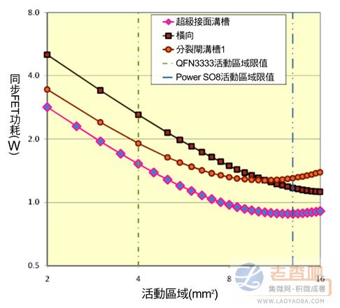 圖5 不同的功率MOSFET結構作為同步FET時,活動區域與功耗之間的關系。開關頻率為1MHz時,輸出電流為25安培。電壓由12伏特轉換為1.2伏特,閘極驅動電壓為5伏特。