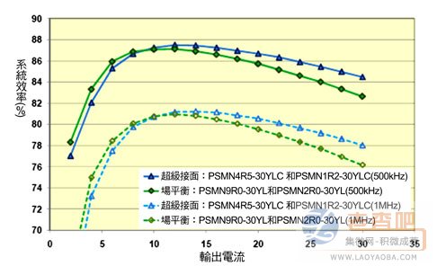 從上述中可知,控制FET的開關速度可能會受到QGD以外的其他因素限制。可從圖7明顯看出,低RDS(on)同步FET(PSMN1R2-30YLC)與中等RDS(on)同步FET(PSMN4R5-30YLC)的開關波形的比較。在這兩個例子中,PSMN4R5-30YLC均作為控制FET??擅黠@地看出,開關節點(即控制FET和同步FET形成的半橋中點)的上升時間與控制FET無關。換言之,開關節點電壓上升所導致的導通損耗不再受控制FET的QGD限制。