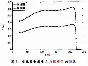 變壓器在中不僅能傳遞能量,同時(shí)還起到了電氣隔離的作用,變壓器的原邊與副邊線圈匝數(shù)比的不同可以達(dá)到升壓或降壓的作用。在模塊工作狀態(tài)下,由于磁芯的渦流效應(yīng),變壓器會(huì)產(chǎn)生很多的熱量,成為模塊熱量產(chǎn)生的主要來(lái)源。實(shí)驗(yàn)中首先測(cè)試了變壓器原邊和副邊線圈的電感量隨溫度的變化,如圖3所示,從圖3中可見(jiàn)隨著溫度的升高,線圈的電感量先增加,然后小幅下降,再小幅上升,在環(huán)境溫度為220℃以前,變壓器的原邊與副本電感量的整體趨勢(shì)是逐漸增加,當(dāng)溫度達(dá)到220℃,磁芯溫度達(dá)到居壁點(diǎn),線圈的電感量迅速降為零。對(duì)于不同磁芯材料的變壓器其居里點(diǎn)溫度有所不同,對(duì)于此類(lèi)變壓器,可知居里溫度在220℃附近。當(dāng)變壓器溫度接近居里點(diǎn)時(shí),變壓器電感量會(huì)迅速減小,會(huì)導(dǎo)致輸出電壓迅速下降。