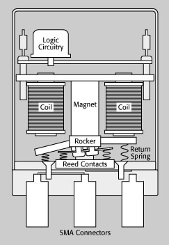 繼電器內(nèi)的容性是限制開關(guān)的信號頻率的常見因素。繼電器的材料和物理特性決定了其構(gòu)成的內(nèi)部電容。比如,在超過40GHz的射頻和微波開關(guān)中,在機電繼電器中采用了特殊的接觸架構(gòu)來獲得更好的性能。圖1顯示了一個典型的構(gòu)造,共同端接位于兩個開關(guān)端接之間。所有信號的連接線路都是同軸線,來保證最佳的信號完整性(SI)。在這種情況下,連接器是SMA母頭。對于更加復(fù)雜的開關(guān)結(jié)構(gòu),共同端接被各個開關(guān)端接以放射狀圍繞。