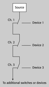 [page]層疊開關(guān)架構(gòu)是多位置開關(guān)的一種替代形式。它采用多個繼電器將一個輸入連接到多個輸出。路徑長度(同時決定了相位延遲)是由信號經(jīng)過的繼電器的數(shù)量決定的。