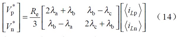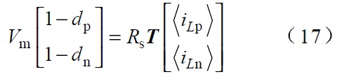 圖中 Vp 、Vn 為不同區間所對應的電壓,Lp、 Ln 和Lt 為不同區間所對應的電感,Tp、 Tn 為不同區間所對應的主控開關,dp 、dn 為主控開關的占空比。由于PWM 開關頻率遠高于電網頻率,因此,在一個開關周期內,各電感的電壓平均值為零,運用回路電流法和節點電壓法對各種開關狀態進行分,析可得出: