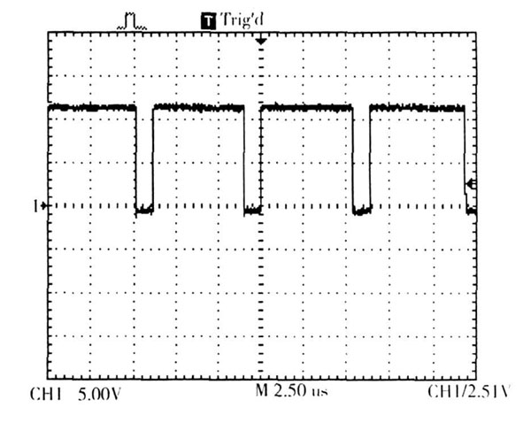 通過(guò)示波器采樣肖特基二極管兩端的波形,同樣以3 顆LED 負(fù)載為例進(jìn)行采樣。