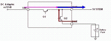 LD6275 具有適應性電源路徑管理(Adaptable Power Path Management, APPM)功能,其為以供給系統端用電為主,對電池充電為輔,如圖3所示;當系統用電超過輸入電源的供給限制時,其電池亦能主動開啟放電功能同時對系統端供給其所需之電能需求,如圖4所示。