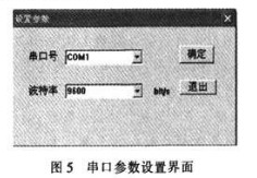 要實現(xiàn)計算機(jī)串行通信的功能,一種較為簡便的方法是使用MSComm(Microsoft Communication Control)通信控件,它提供了標(biāo)準(zhǔn)的事件處理函數(shù)過程,是微軟公司開發(fā)的專門用于串行通信的控件。它是高級語言編寫的串行通信程序和PC串口之間的橋粱。本系統(tǒng)采用得就是這種方法。設(shè)置控件的屬性。添加控件的響應(yīng)代碼。就可以使串口按照要求進(jìn)行工作。在這個界面,可以進(jìn)行串口號和波特率的設(shè)置。通信參效設(shè)置界面如圖5所示。