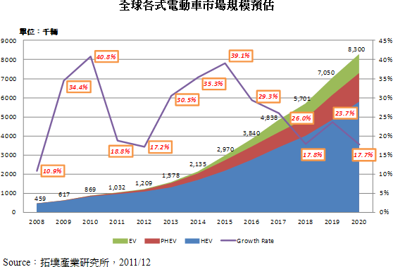 2020年前全球新能源車市場成長動能主要以油電混合車(Hybrid Electric Vehicle;HEV)為主,預計目前仍為全球電動車銷售上升主力,約占整體電動車市場70%。2011年后隨著鋰電池技術漸趨成熟,插電式油電混合車(Plug-in Hybrid Electric Vehicle;PHEV)市場逐漸起飛,2012年起將呈顯著成長,2020年銷售量將達150萬輛,占整體電動車市場的18%,而完全仰賴電池做為動力來源的純電動車(Battery only Electric Vehicle;BEV),由于各國政策推動期程不一,現仍處于示范運行階段,預計2020年占整體電動車市場的12%。