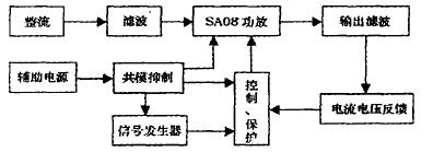 單相220V AC電壓一路經整流橋整流濾波后作為SA08的功率電源;另一路經AC/DC轉換、共模抑制后作為控制電路和SA08輔助電源;信號發生器產生頻率400Hz;幅度可調的正弦信號;信號發生器通過優化電路設計和選用低溫漂元件實現輸出頻率的穩定;控制電路對輸入指令信號進行偏置、放大、PID及濾波處理、輸出限幅等;最后作為SA08輸入信號控制其功率輸出。過壓保護和過流保護也通過控制電路實現;SA08輸出的高頻高壓SPWM波經LC濾波器后供給負載;反饋電路直接從負載上進行電壓電流取樣;確??刂频木取?br />