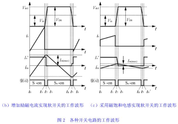 為了克服上述零電壓軟開關工作時電流應力過大的缺點。可以在變壓器次級整流二極管上串聯一個磁飽和電感ls,如圖1所示。當電壓vds1下降到vin時,[t5~t0′]期間磁飽和電感ls瞬時阻斷整流二極管,使得變壓器勵磁電流不必負擔負載電流,而可完全用來給電容cds2、cds1充放電。這樣,不必大量減小變壓器勵磁電感,較小的勵磁電流就可以保證電壓vds1諧振到零,實現主功率開關管的零電壓軟開通。關鍵工作波形如圖2(c)所示。