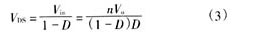 上式說明,當變壓器匝比愈小時,對于一定的輸入電壓和輸出電壓的變換器,開關管電壓應力vds愈小。所以,有源鉗位正激變換器一個顯著優點是可以降低開關管電壓應力,從而可選用額定電壓較低、通態電阻較小的功率開關管。另外,當變壓器變比n確定后,開關管電壓應力僅與占空比有關,如圖3所示。顯然,當占空比為0.5時,開關管承受最小的電壓應力。當輸入電壓變化時,如果將占空比設計運行在以0.5為中心的對稱范圍內,則可使開關管承受的電壓應力基本保持恒定。
