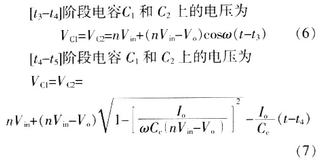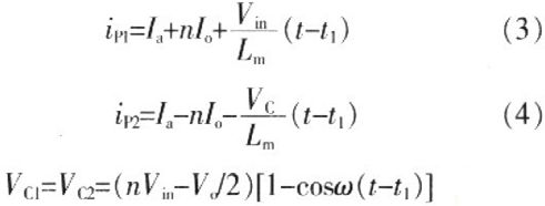 兩端電壓從零開始諧振增大,在半個諧振周期后達到最大值VC1max=VC2max=2nVin-Vo,此時模態(tài)2結(jié)束。模態(tài)2中,VD5=VD6=0,VD7=Vo。二極管D2、D3兩端反向電壓從V0逐漸增大VD2=VD3=4nVin-V0。