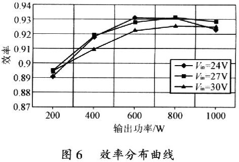 圖6為該變換器在24V、27V、30V輸入時對應(yīng)不同輸出功率的的效率分布曲線圖。其中輸入電壓為24V,輸出功率600W時最高效率可達93.1%,27V滿載1 000W時效率為92.8%。