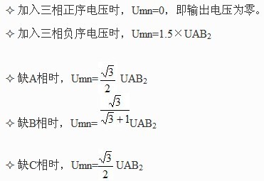 按負序過濾器的工作原理,從上述公式中,可得出,在標準電壓輸入下,可以計算出相關輸出電壓Umn值,見表1
