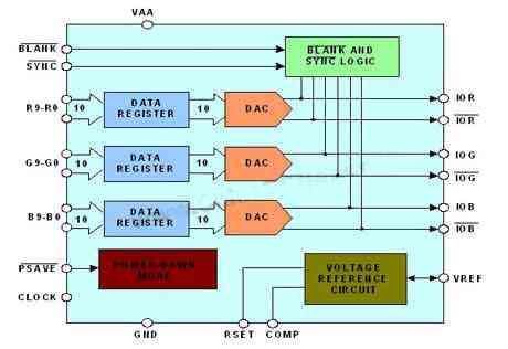 因此,假如有一個(gè)1024×1024@60Hz的圖像系統(tǒng),回掃因子為0.8。那么:時(shí)鐘頻率=點(diǎn)速率=1024×1024×60/0.8=76.8Hz。所要求DAC的時(shí)鐘頻率是78.6MHz。CS7123的最大時(shí)鐘頻率為240MHz,因此可以支持最高達(dá)到1600×1200@100Hz的分辨率。