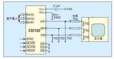 CS7123還有SYNC同步信號(hào)和BLANK黑電平控制信號(hào)這兩個(gè)附加的視頻控制信號(hào),CS7123也具有一個(gè)待電模式。CS7123采用5V CMOS工藝制造,單片CMOS結(jié)構(gòu)確保了低功耗性能。CS7123的主要功能是將三路RGB信號(hào)轉(zhuǎn)換為模擬RGB信號(hào)后輸出到顯示屏顯示。另外,它也可以當(dāng)作三路單獨(dú)的DAC使用。