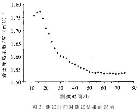 測試時間對測試結果的影響如圖3所示。由圖3可以看出,測試時間不同,計算出的鉆孔周圍地下巖土的平均導熱系數也不同。當測試時間達到約50小時后,測出的導熱系數趨于穩定,維持在1.530~1.538 W/m℃的范圍之間。通常測試時間可以選取60小時左右,這樣既可以保證獲得正確的導熱系數,又可以避免測試時間過長。