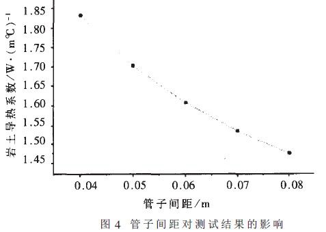 維持其它條件不變,只改變導管上升管與下降管之間的間距,其對巖土導熱系數的影響見圖4。當管間距變化約為0.0lm時.計算出的導熱系數變化約為4~8%。由圖中可以看出,間距越大,計算出的導熱系數越小:這是由于間距越大,鉆孔內的熱阻越小,在總熱阻不變的情況下.周圍巖土的導熱熱阻大。即導熱系數小。因此如何確定管于間距是設計地源熱泵系統中值得認真探討的問題。