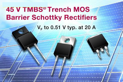 Vishay發布12個采用不同封裝的45V TMBS® TrenchMOS勢壘肖特基整流器器件可用于光伏太陽能電池旁路保護,具有10A~40A的寬額定電流范圍,在20A電流下的典型VF低至0.51V。
