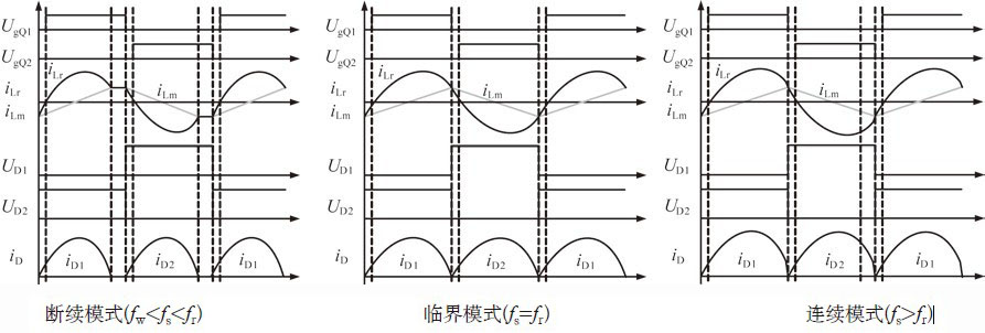 諧振網絡由諧振電感L r、諧振電容C r、激磁電感L m組成。圖2為其主要的理想工作波形,根據工作頻率的不同,我們可以把它分為三個模式,即斷續模式(fw<fs<fr)、臨界模式(fs=fr)和連續模式(fs>fr),其中fw為第一諧振頻率,fr為第二諧振頻率,fs為開關管工作頻率。