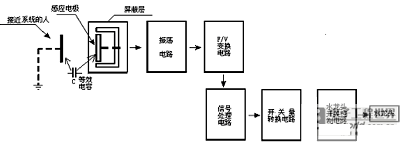 系統組成框圖如圖3所示,從框圖可以看出控制信號的流程:當人或其它物體接近電容式接近開關時,等效電容的容量值會發生變化,從而改變LC振蕩器的振蕩頻率,F/V電路將LC振蕩器輸出的頻率量轉化成電壓量后,交給信號處理電路,該部分將電壓信號進行一系列的處理(包括:放大、整形等)后傳給開關量變換電路,開關量轉換電路實際上是A/D轉換器,它將模擬電壓轉換為數字量,水龍頭控制電路由開關量轉換電路的輸出量控制,它產生控制信號控制水龍頭的開與關。本系統設計成當人接近水龍頭一定距離時,水龍頭自動開啟,離開一定距離后水龍頭自動關閉。