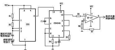 連線圖如圖4所示,由555定時器組成的振蕩器,它的振蕩頻率為:f=1/0.69*(R1+2*R2)*(C//CT),C就是電容式接近開關的等效電容值,CT為頻率調節電容,通過C的變化從而使振蕩頻率變化,將此種變化傳給F/V電路,引起F/V電路的輸出電壓變化。由鎖相環CD4046組成的F/V變換電路將頻率值變成電壓值后,經精密運放OP-07線性放大后輸入到開關量轉換器(A/D轉換器)的輸入端。